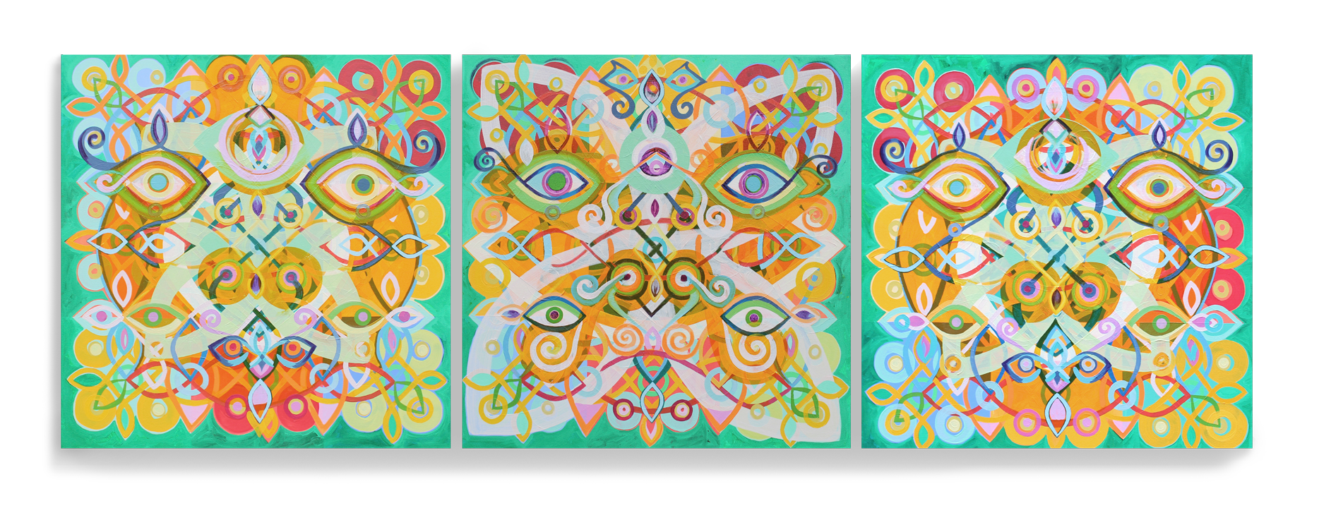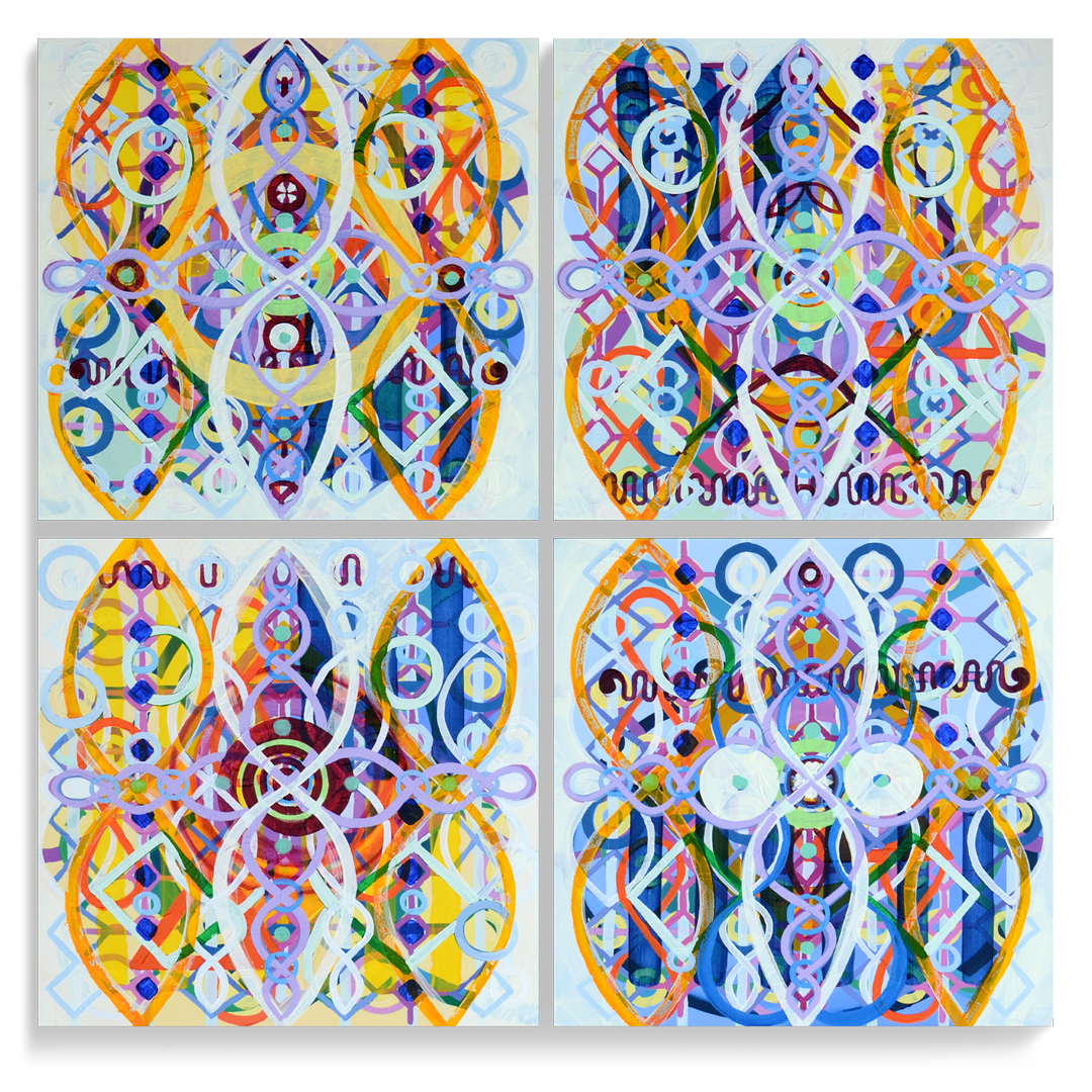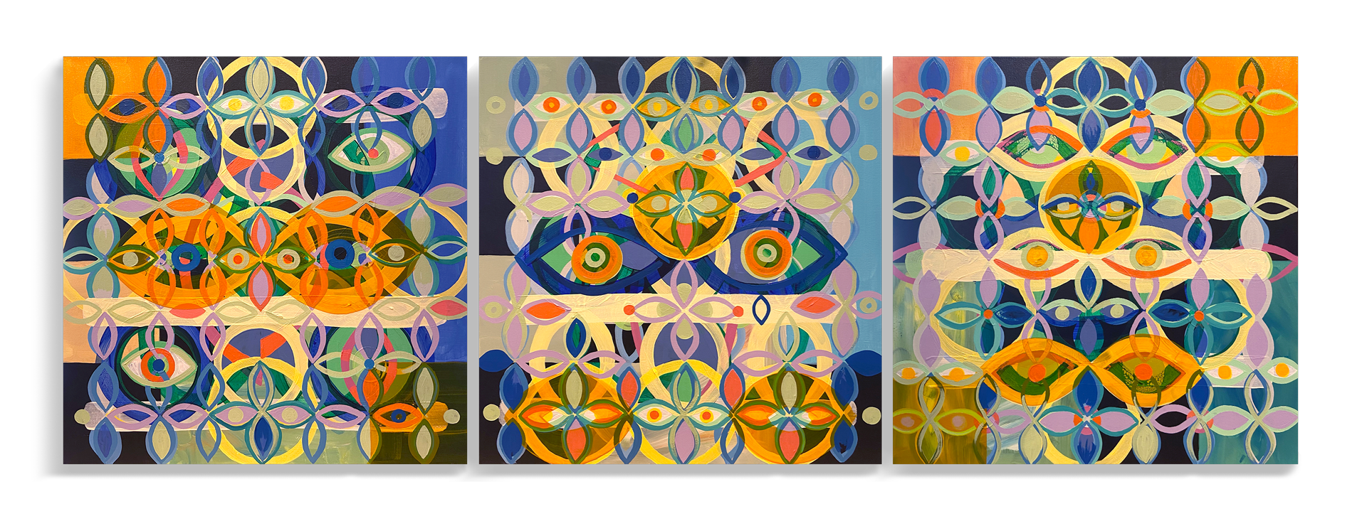 “…they plummet the eye of the beholder with geometries of color that kaleidoscope the seen with the unseen.”